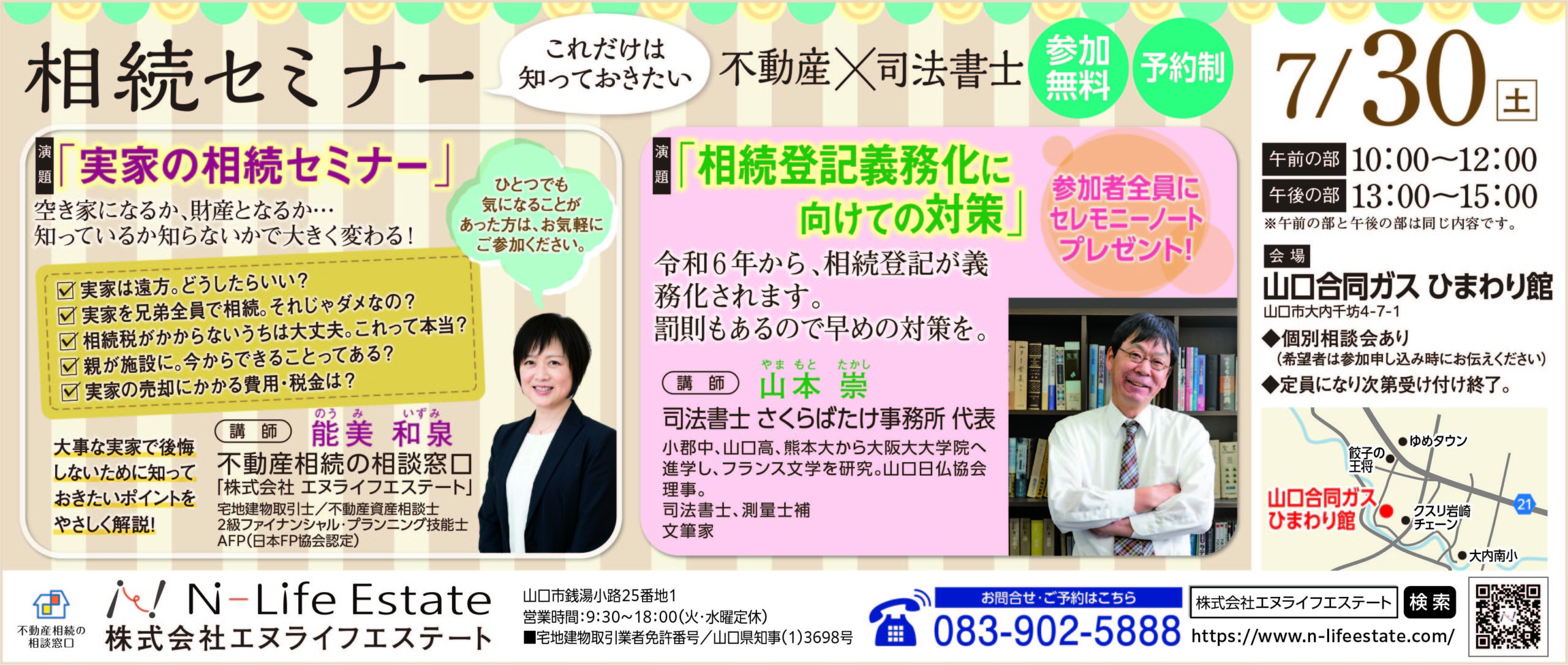こんにちは。山口市役所ちかくで司法書士をしている山本崇です。ホームぺージの「さくらばたけ事務所からのお知らせ」のところに7月14日に相続セミナーについての告知をしていますが、昨日23日にはサンデー山口にセミナー開催の広告が掲載されました。できるだけ多くの人に見ていただきたいですし、目立ったほうがいいと思ってかなり広告費を奮発して大きく載せたつもりです。私の妻がこれを見て、「ずいぶん大きく載せたね」と言ってきて、ちょっと私も得意げです。でも、それに引き続きて「ウソが書いてある」と言われました。ん?ウソなんてどこにも載せたつもりはないのですが、なんだ?と思って聞いてみると、私のプロフィールにある「文筆家」というのがウソだというのです。なんとも失礼だなあ。まあ、たしかに文章を書いてそれだけで生活している訳ではないですけど、山口県司法書士会の機関紙「桐友」に頻繁にエッセーを書いてますし、この10月には文芸山口という同人誌にもエッセーかちょっとした物語(小説というほどではないです)を掲載する予定です。
